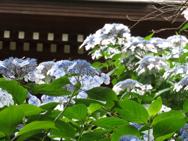 大日堂の脇にはヤマアジサイ、土佐の暁が咲いてます。